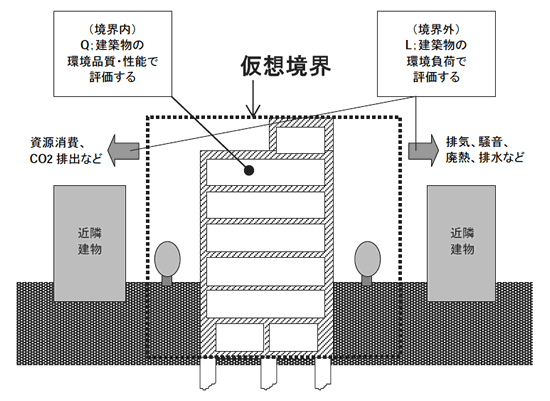 CASBEEでは、敷地境界等によって定義される「仮想境界」で区分された内外2つの空間それぞれに関係する2つの要因、すなわち「仮想閉空間を越えてその外部(公的環境)に達する環境影響の負の側面」と「仮想閉空間内における建物ユーザーの生活アメニティの向上」を同時に考慮し、建築物における総合的な環境性能評価のしくみを提案した。CASBEEではこれら2つの要因を、主要な評価分野Q及びLとして次のように定義し、それぞれ区別して評価する。