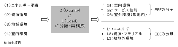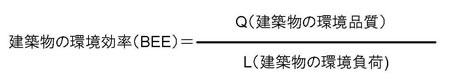 前項で整理したように、QとLの2つの評価区分を用いた環境性能効率(BEE)は、CASBEEの主要概念である。ここで、BEE(Built Environment Efficiency)とは、Q(建築物の環境品質)を分子として、L(建築物の環境負荷)を分母とすることにより算出される指標である。