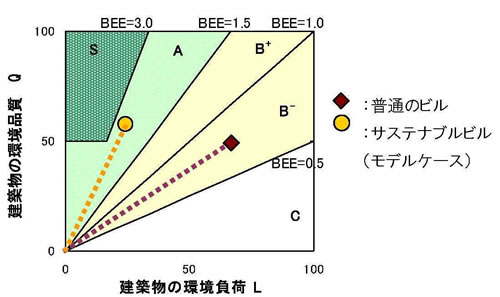 BEEを用いることにより、建築物の環境性能評価の結果をより簡潔・明確に示すことが可能になった。Qの値が横軸のLに対して縦軸にQがプロットされる時、グラフ上にBEE値の評価結果は原点(0,0)と結んだ直線の傾きとして表示される。Qの値が高く、Lの値が低いほど傾きが大きくなり、よりサステナブルな性向の建築物と評価できる。この手法では、傾きに従って分割される領域に基づいて、建築物の環境評価結果をランキングすることが可能になる。グラフ上では建築物の評価結果をBEE 値が増加するにつれて、Cランク(劣っている)からB-ランク、B+ランク、Aランク、Sランク(大変優れている)としてランキングされる。